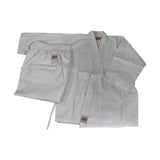 A traditional uniform made with 7 oz. middleweight cotton-polyester fabric for increased durability and easy care. Jacket is full-cut, while the pants feature a drawstring waist with a generous gusset. White belt included with purchase. Imported.